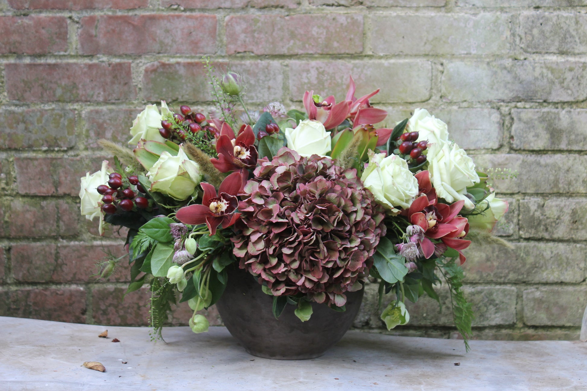 A low and lush design that brings warmth and richness to any setting. This expertly crafted bouquet combines depth and texture, including Antique Hydrangea, creamy Roses, red Berries and golden Cymbidium Orchids. Highlighting seasonal elements that add natural elegance and comfort to your space.