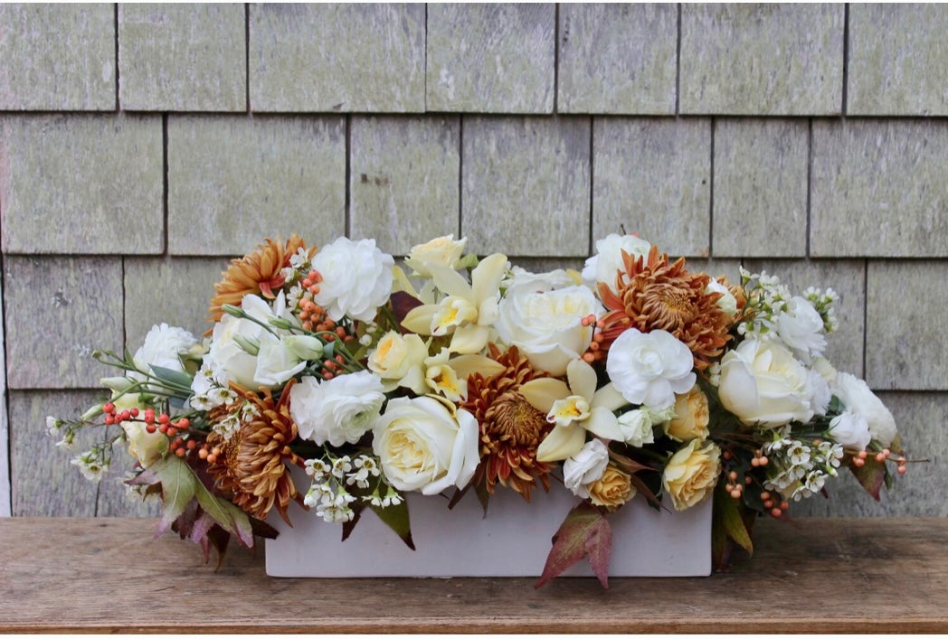 Bring warmth to your Thanksgiving table with this low and lush composition of Autumnal Blooms.