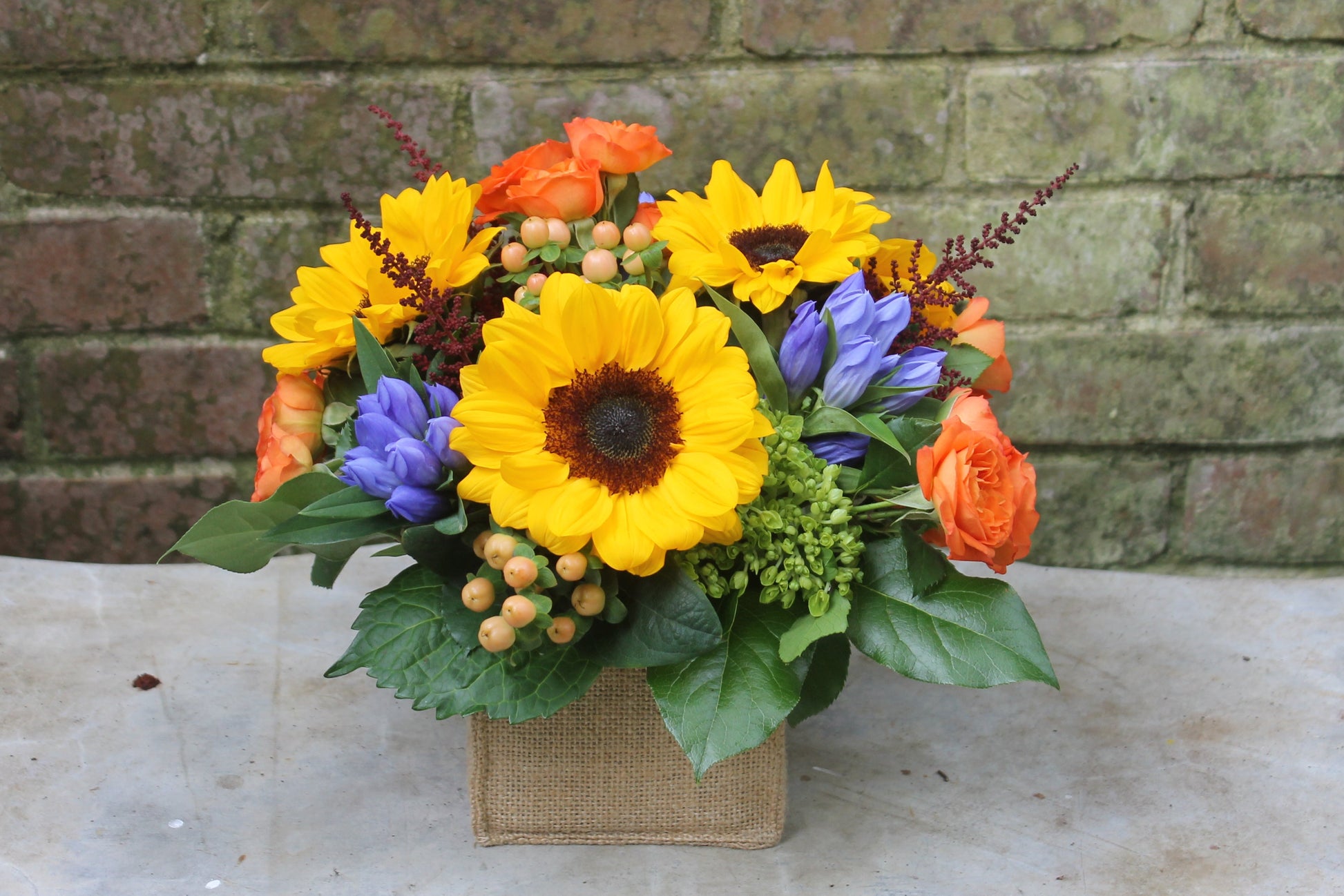 A low and tightly arranged selection of seasonal fall blooms. Comes in a glass square vase.