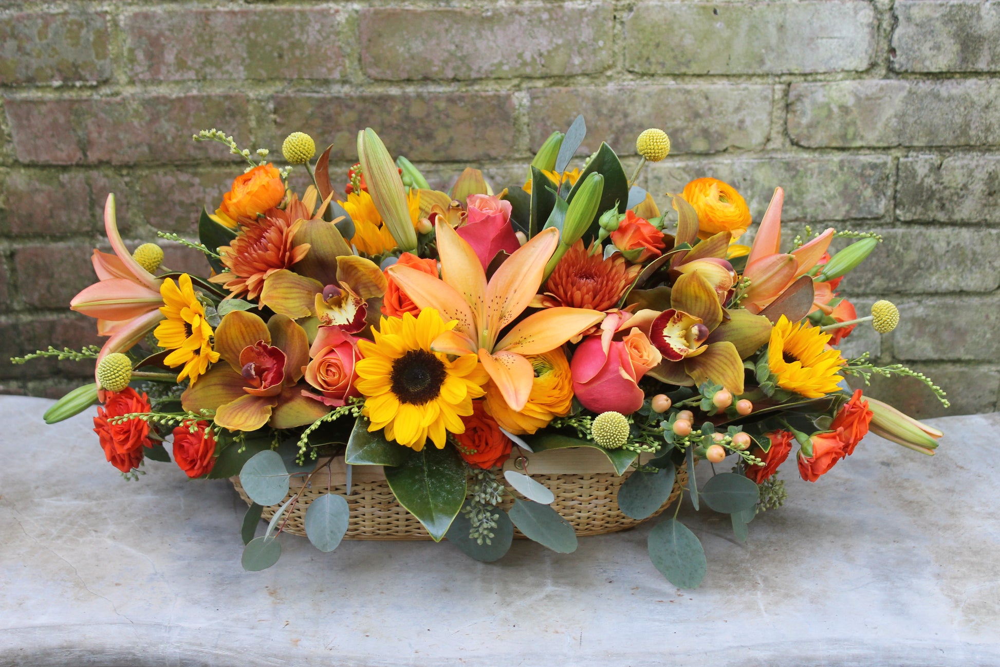 This vibrant arrangement showcases a rich blend of autumn hues and textures, perfect for enhancing your Thanksgiving table.