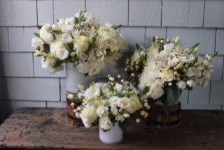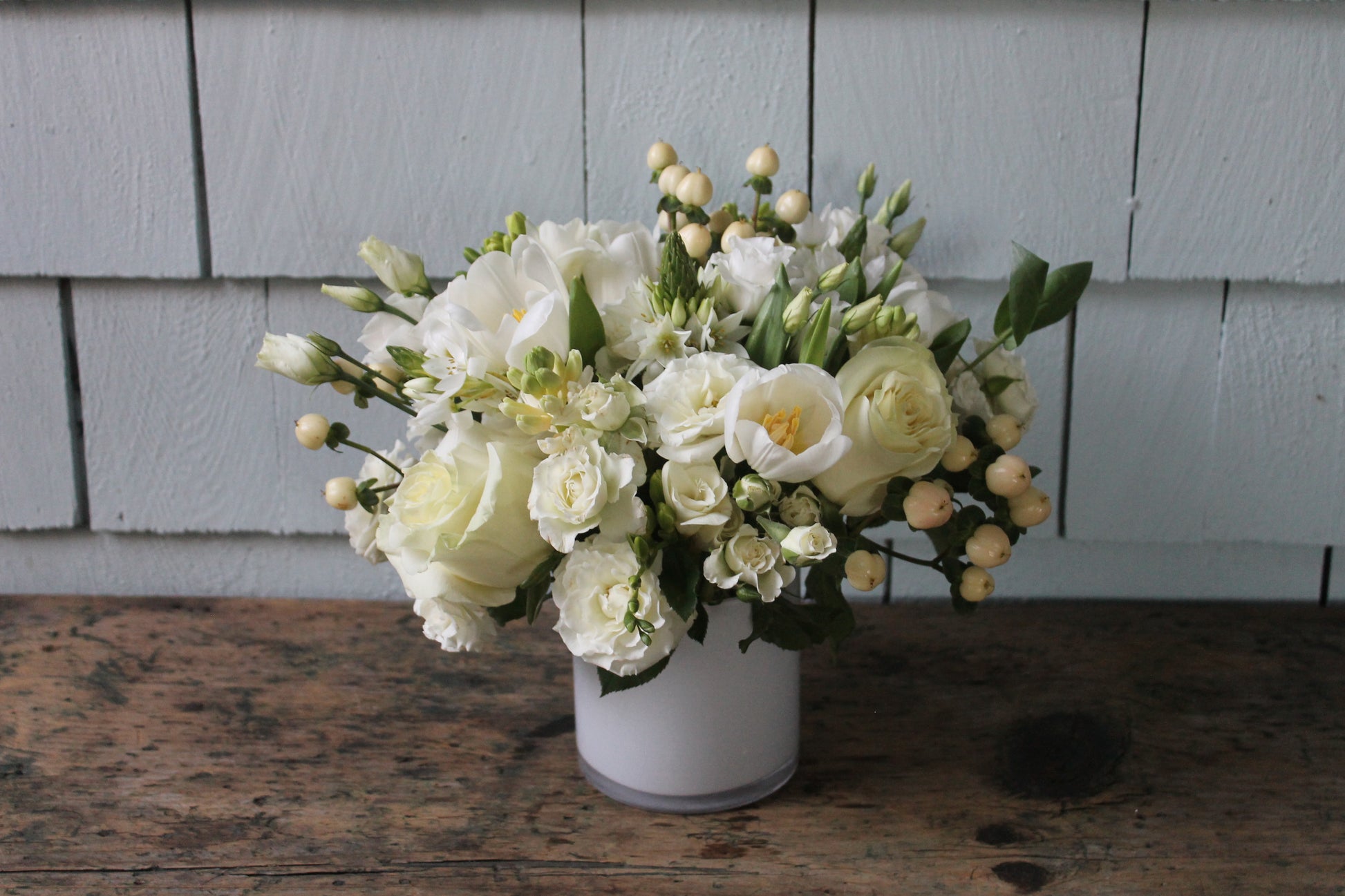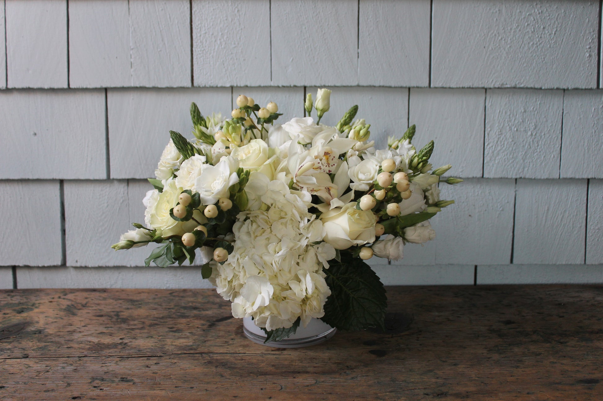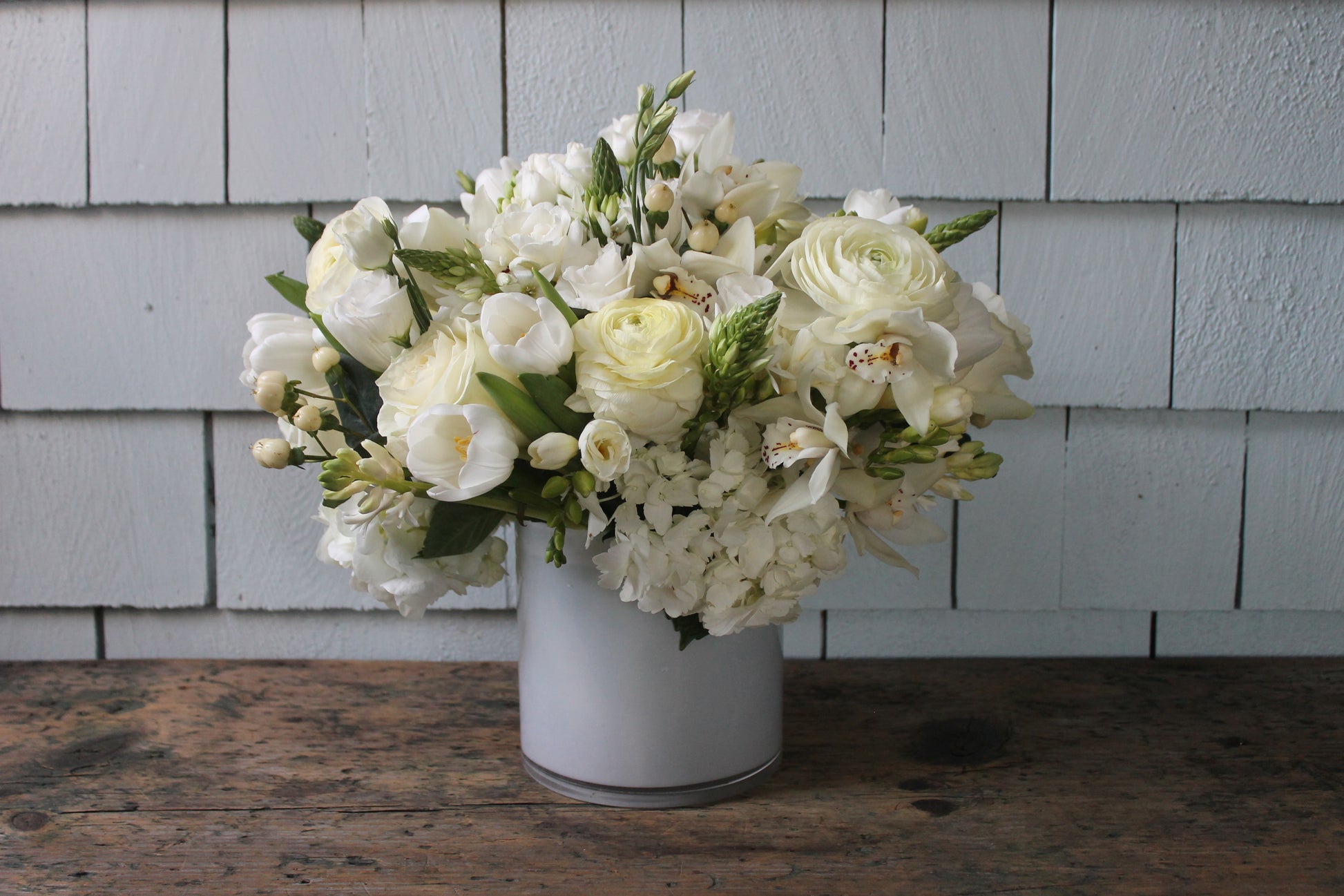 This elegant arrangement features a dense, all-white blend of hydrangeas, roses, cymbidium orchids and ranunculus artfully presented in a white glass vase. It makes a sophisticated and festive centerpiece for any holiday celebration.