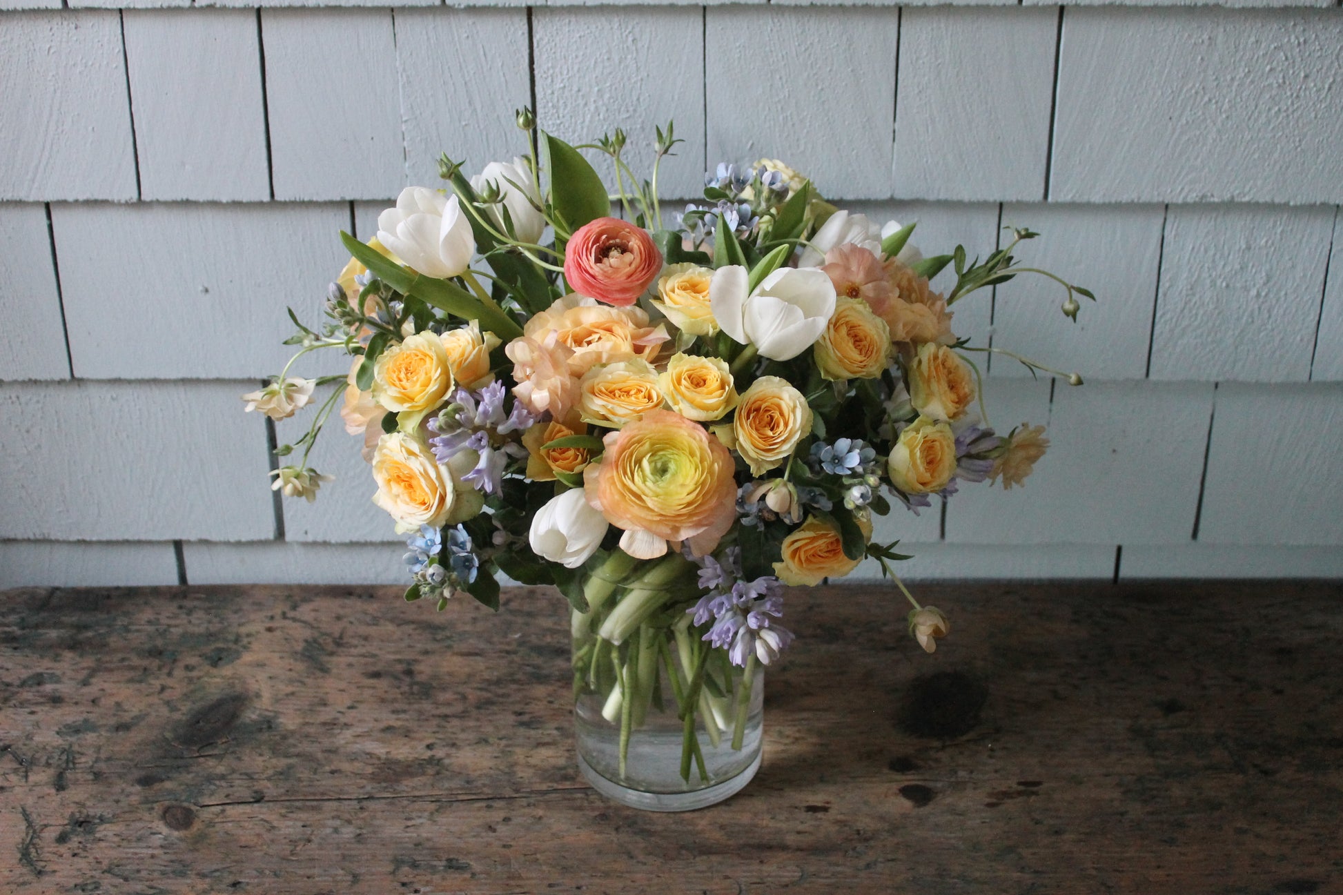 A lively assortment of springy tulips, hyacinth, and ranunculus in pastel colors.